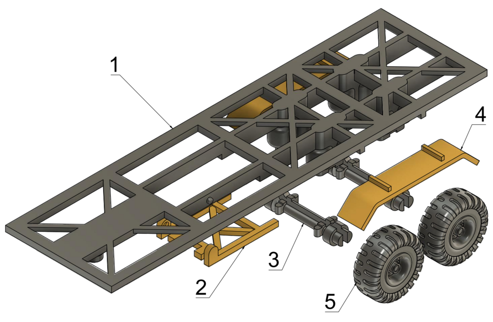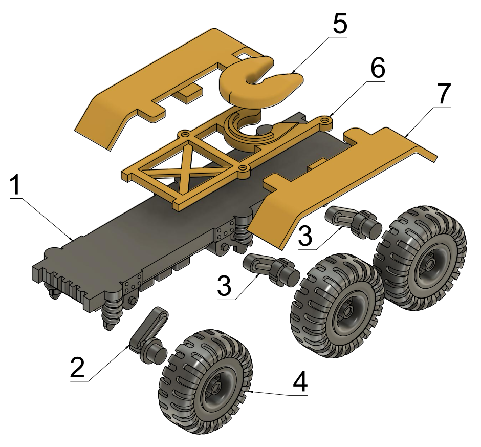 Included in Military Cargo Transporter are a variety of core components and variant pieces. The Military Cargo Transporter can also be built in a stowed, or unloading position as shown. The trailer is designed to work with a variety of 28mm scale containers, as the lifting arms can slide on the trailer.
